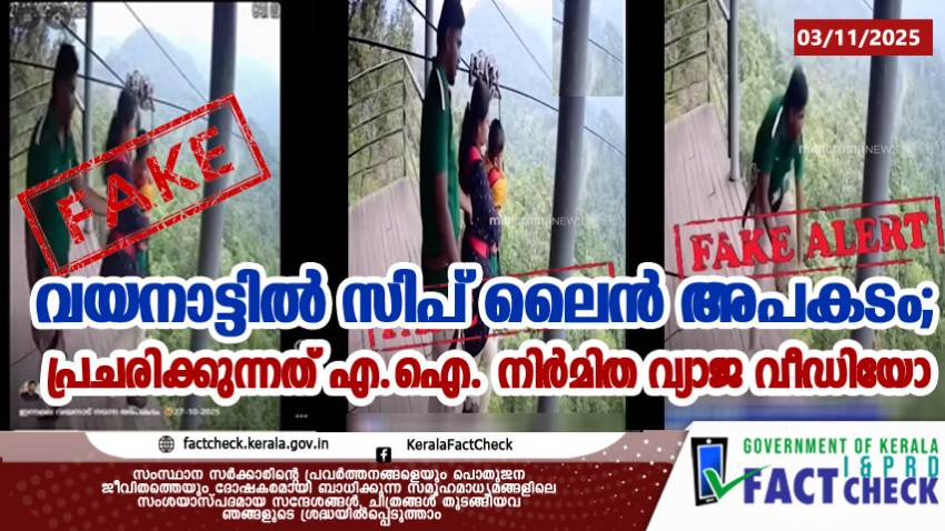 വയനാട് ജില്ലയിൽ സിപ് ലൈൻ തകർന്ന് അപകടമുണ്ടായി എന്ന രീതിയിൽ സാമൂഹ്യമാധ്യമങ്ങളിൽ വ്യാപകമായി പ്രചരിക്കുന്ന വീഡിയോ നിർമിത ബുദ്ധി (AI) ഉപയോഗിച്ച് നിർമ്മിച്ച വ്യാജ ദൃശ്യങ്ങളാണ്. ഇത്തരത്തിൽ ഒരു അപകടവും ജില്ലയിൽ റിപ്പോർട്ട് ചെയ്തിട്ടില്ലെന്ന് അധികൃതർ വ്യക്തമാക്കി.